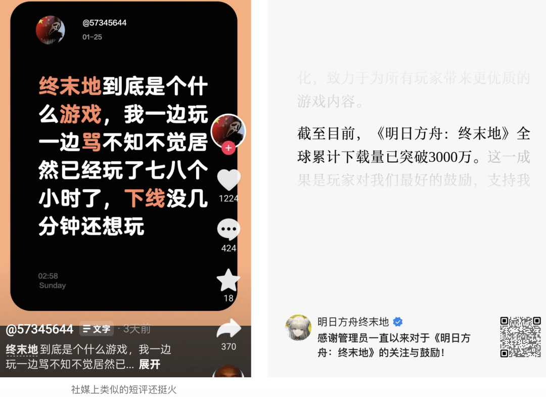 最终,上述违背市场预期和行业惯性的做法,帮助终末地快速度过了最危险的时期。甚至可以说一天半3000万的下载量(官方公布数据),叠加舆论回正得过于迅猛的反差,让游戏在口碑方面实现了天胡开局。