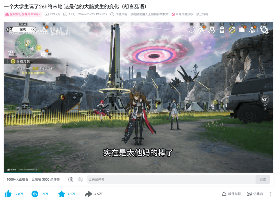 1月23日晚,一位大学生玩了26小时终末地,发了一条语无伦次但真情流露地吹爆终末地的视频,放话“我玩了10年二游,我没有玩过那么好玩的游戏”。结果这条视频引爆社区,入选热门,如今动不动还有3000+的同时在看,而且集聚了大量正面评论,隐隐有成为新一代圣经的势头。