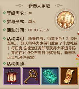 在2月2日-2月8日期间,少侠们只需完成每日指定任务,就能轻松获得大乐透奖券,已获得的奖券可一直保留至活动结束,不用担心错过任何一次中奖机会,每日19点准时公布当日中奖号码,每一次开奖都有新期待,重磅惊喜大礼静候各位少侠前来解锁!