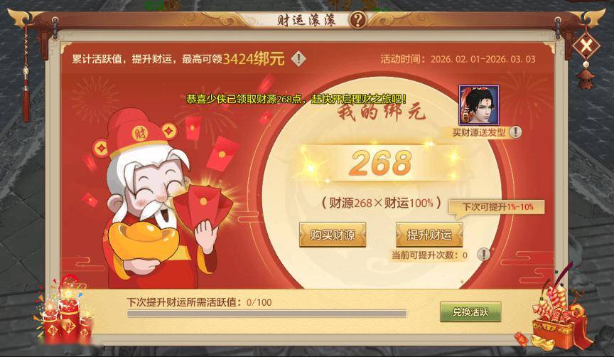 除了免费财源和高额收益,活动福利还有惊喜加码!少侠们参与日常各类活动,累计活跃值就能解锁财运提升次数,最高可累计10次,每一次提升都能实打实提高财源收益,让绑元赚得更轻松,躺着也能积累财富!