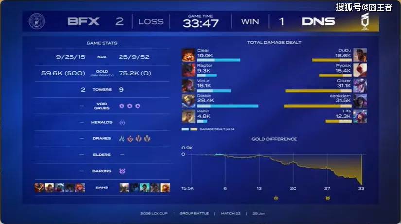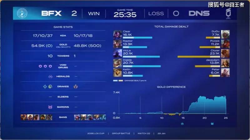 第一局比赛,BFX蓝色方,禁用:妮蔻、韦鲁斯、奎桑提、纳尔、泰坦,选用:Clear鳄鱼、Raptor蔚、VIcLa沙皇、Diable卢锡安、Kellin娜美;DNS红色方,禁用:潘森、杰斯、兰博、巴德、EZ,选用:Dudu塞恩、Pyosik皇子、Clozer发条、deokdam芸阿娜、Peter露露