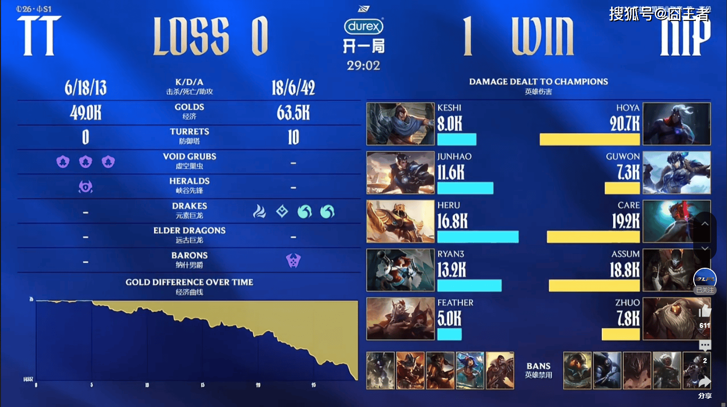 最终NIP疯狂碾压TT,赢下比赛。坦率地讲,这场比赛,也许不能称之为比赛,打主播队都不会有这样的比分差吧?26分钟2万经济差,线上被无限单杀。难怪大主播都去二路解说都看LCK去了,LPL这质量,连官方解说自己都不看。
