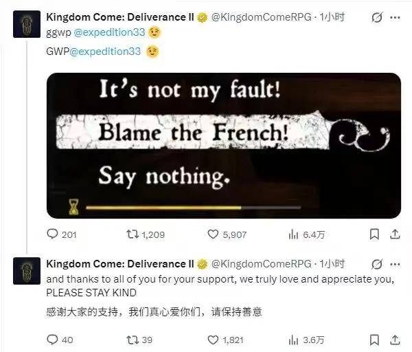 当然,这种情绪也不只存在于玩家群体中,包括《天国:拯救2》的开发商战马工作室也在推特接连发了几条动态,尽管措辞带着几分典型的捷克式黑色幽默,但轻松的氛围背后,多少也能读出一些失落。