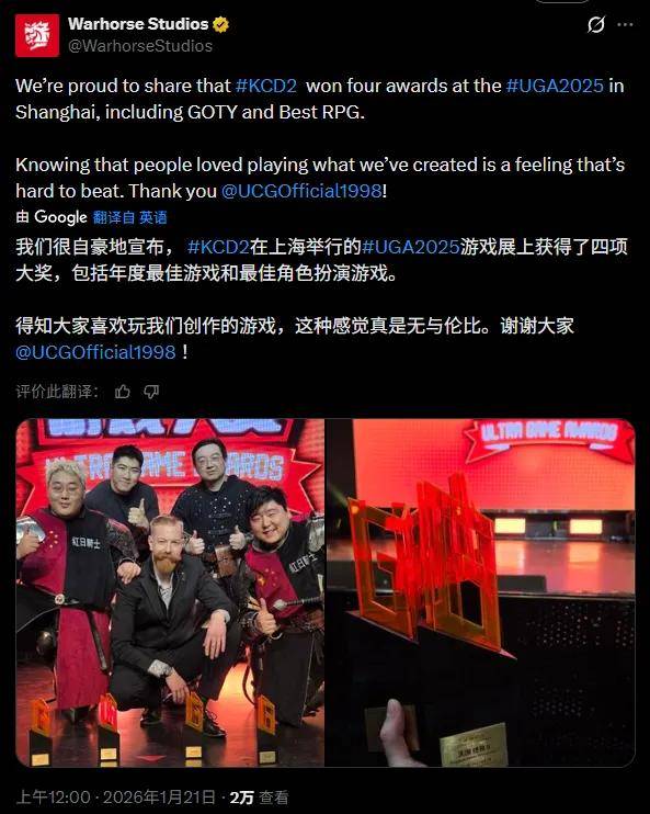 不过可喜的是,在最近由国内媒体UCG主办的颁奖典礼UGA上,《天国:拯救 2》一口气拿下了包括“年度游戏”在内的四个奖项。当奖项颁发到第二个时,战马工作室的市场总监 Tobi上台领奖,一如既往地延续了捷克式幽默:“在这之前我们一个奖都没拿到,现在一下有了两个。”