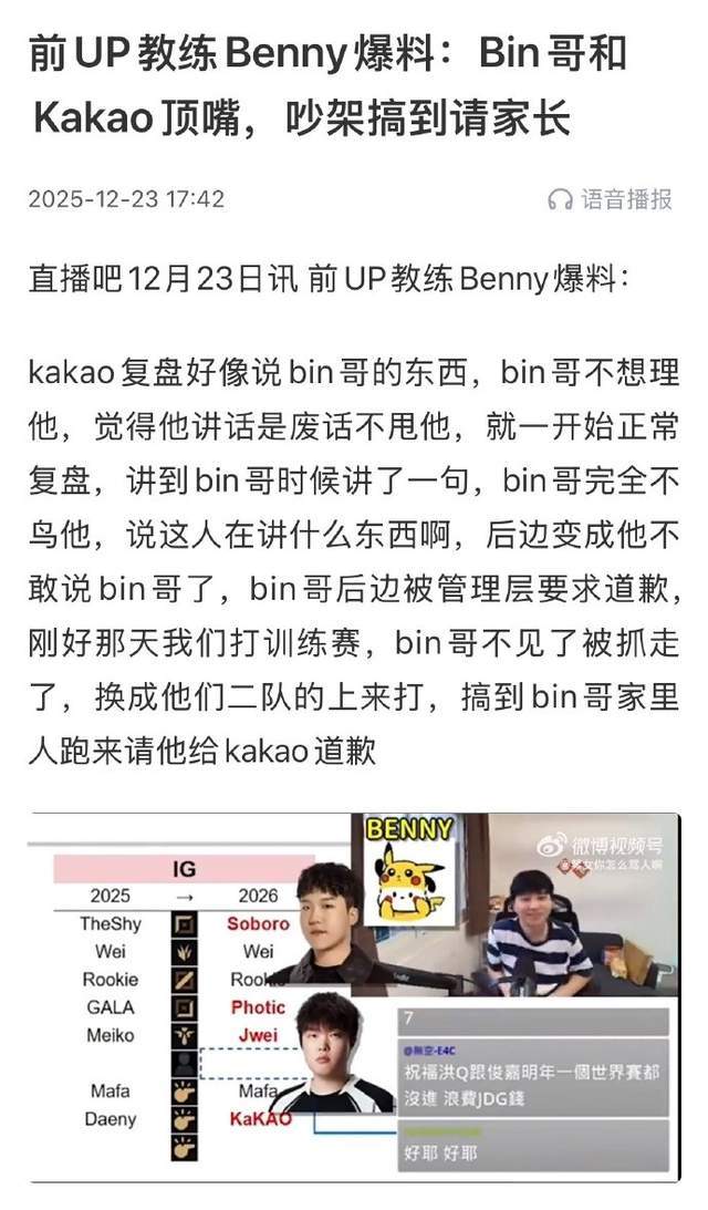 在此之前,曾担任UP教练的Benny在去年年底就爆料过类似的事件,当时他声称Bin因为和Kakao在复盘的问题上发生了不愉快,Bin甚至和当时教练组成员的Kakao顶嘴。事后甚至是Bin家里人过来让他给Kakao道歉,这件事才终于得到了解决。如今Bin又疑似与BLG的领队有了矛盾,只是不知道这次问题能否得到解决。