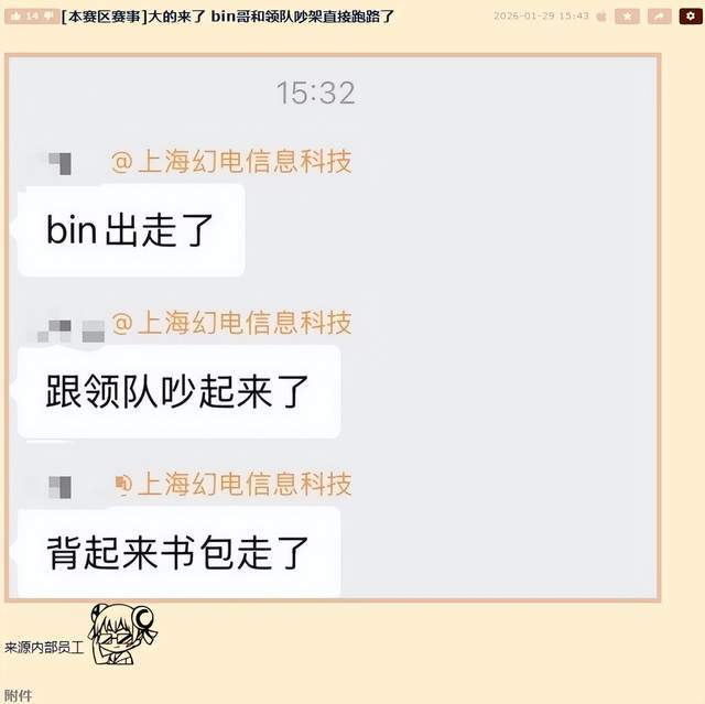 不过相比近期赛场上的失利,场外BLG却陷入了更大的麻烦当中。近日有疑似圈内知情人士在网上进行爆料,晒出了一张后缀带有“上海幻电信息科技”认证的聊天截图。从图片中的对话内容来看,这位疑似B站母公司内部员工的网友透露Bin从BLG出走,原因则是跟领队发生了争吵,因此脾气上来的Bin哥脾气上来直接背着书包就离开了基地。