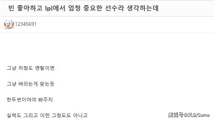 甚至LCK赛区的观众,都在论坛里为BLG打抱不平:虽然我也喜欢Bin,也觉得他是LPL非常重要的选手,但如果他心态就这水平的话,一次两次还能包容一下,连续犯应该直接放弃掉才对,而且Bin现在的实力,也非当年那般了,连国外观众都看不下去,可见Bin的嚣张,是众所周知的。