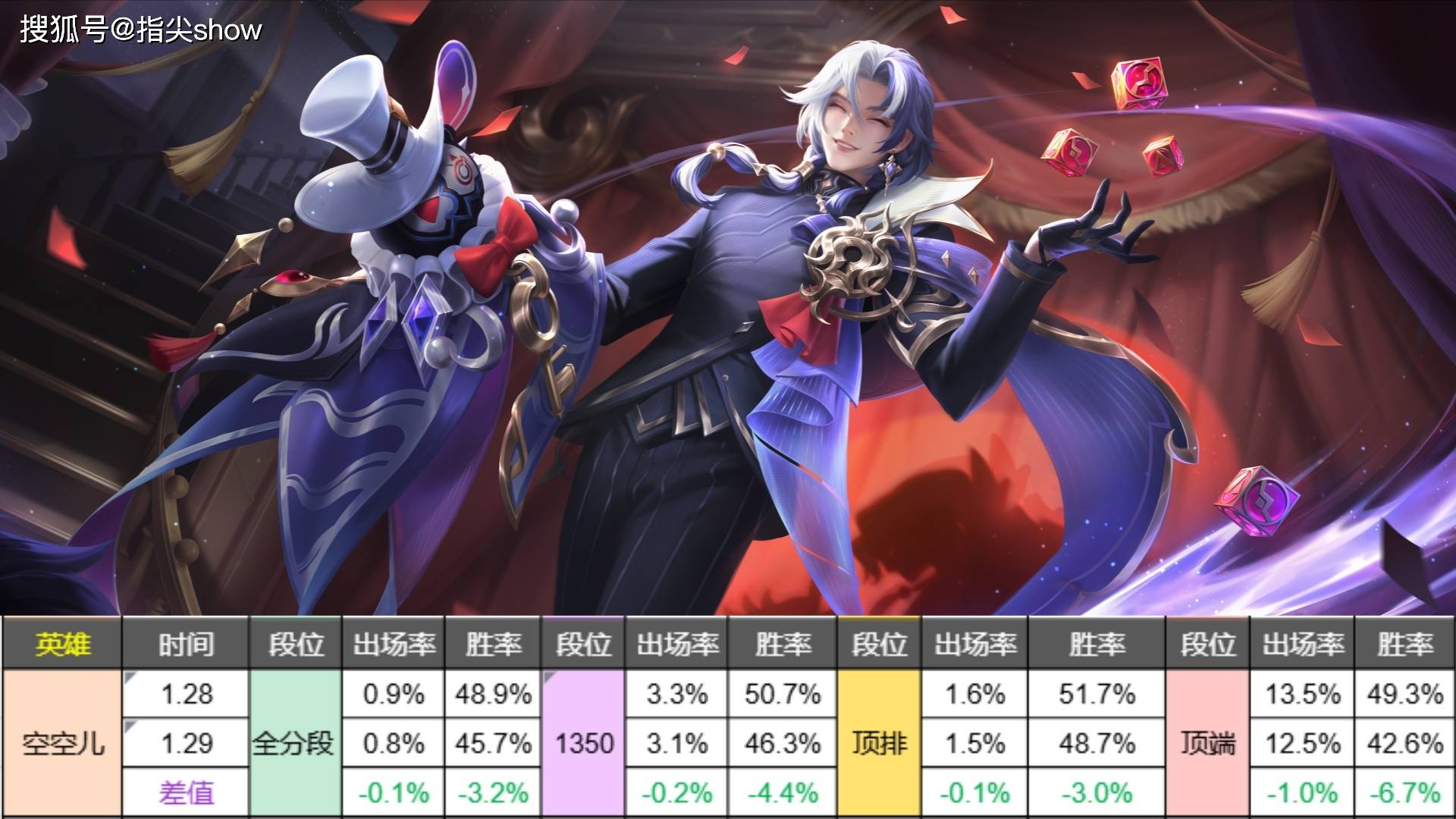 全拍胜率降幅3.2%,巅峰赛1350降幅4.4%,顶排降幅3%,顶端巅峰赛降幅达到了恐怖的6.7%,直接从一个强势英雄变成了末流下水道,我想这也不是策划的本意。