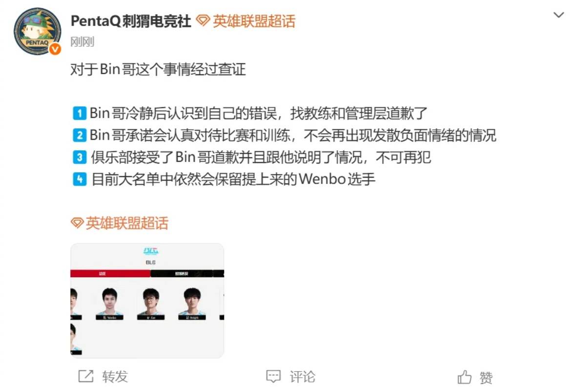 这一点Bin肯定做得是不对的,而最新爆料显示,Bin已经认错道歉,并且回归首发位置,而新提上来的上单Wenbo则继续留队。