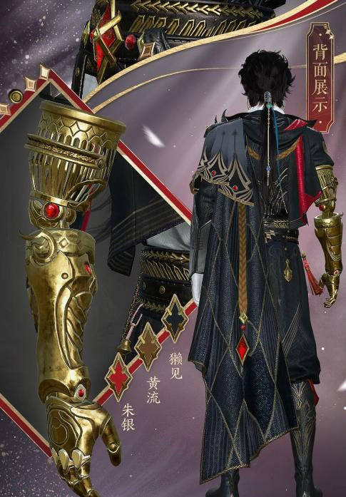 再看【夜绸袍】细节方面,右臂乃金色机械臂,威猛异常;腰束红宝石镶边之革带,显露出腰肢坚韧孔武之美感;足下蹬着乌皮长靴,更衬托出双腿修长之姿。此外,背部悬挂一袭墨色长袍,袍面绣满繁复花纹,华贵而不是霸气。若着此装行走江湖,必能引人注目,回头率蹭蹭暴涨。