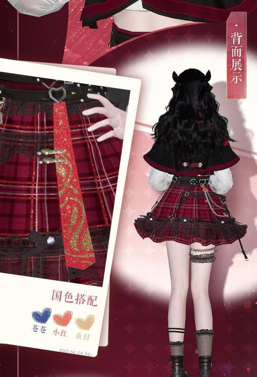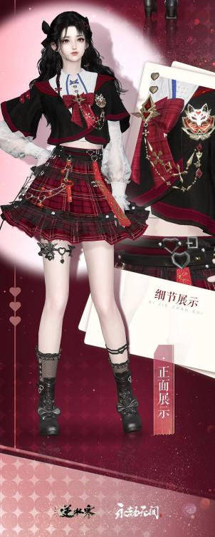 【春日序曲】以红黑为主色调,短衫之上绣以繁复细腻的金线花纹,腰间系一条朱红色绸带,轻柔地束住纤细腰肢,更显身姿婀娜。【春日序曲】胸前饰有一枚精致银色徽章与娇俏蝴蝶结,肩头两侧的宽袖随风摇曳,增添了几分灵动与生机。