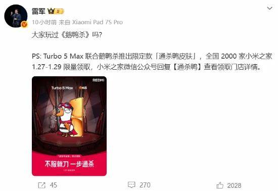 此外,1月27日晚,小米集团创始人雷军还在社交平台发文,询问粉丝是否玩过热门社交游戏《鹅鸭杀》(Goose Goose Duck),迅速引发了网友的热情回复。