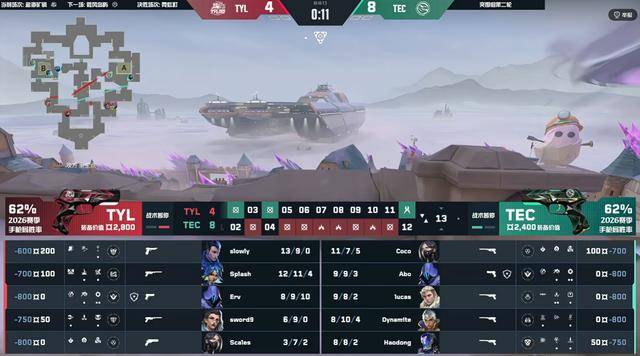 TEC经过暂停调整,连续拿到三分。第8回合TEC打A,Coco蝰蛇展开大招毒雾,天禄回防进入毒雾拿到对枪控制权,但被TEC拖延太多时间,虽然打赢,但拆拆包时间不够。