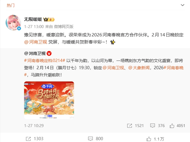 随后官方又宣布暖暖即将登上河南卫视的春晚,要知道这几年后者一直在靠国风内容狠狠出圈,暖暖能走上这个舞台,含金量不用多说。