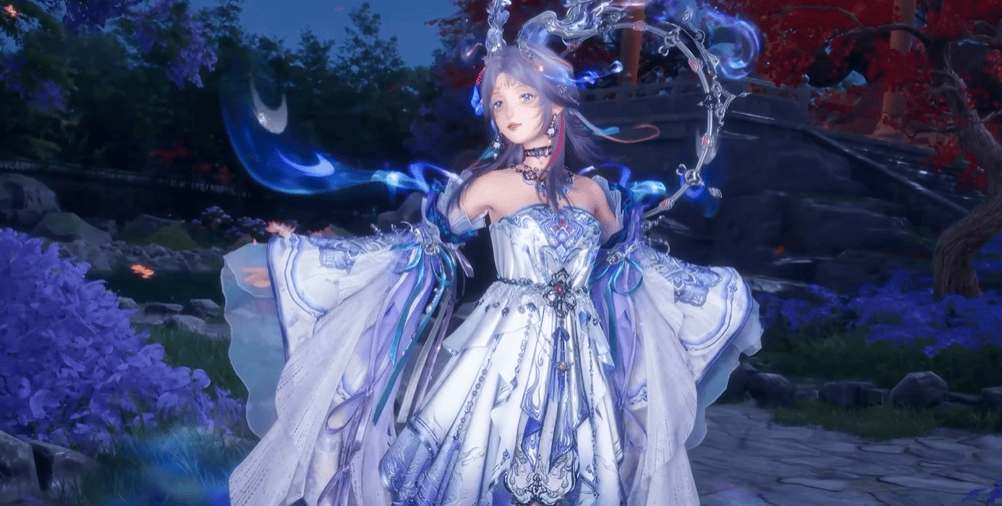 在细节方面,珠链与玉石点缀其上,随裙摆摇动,则更加凸显出华贵感。而半黑半白的流云发,衬着脑后半紫半白的破碎面具,则为整套服装增添了几分妖异。