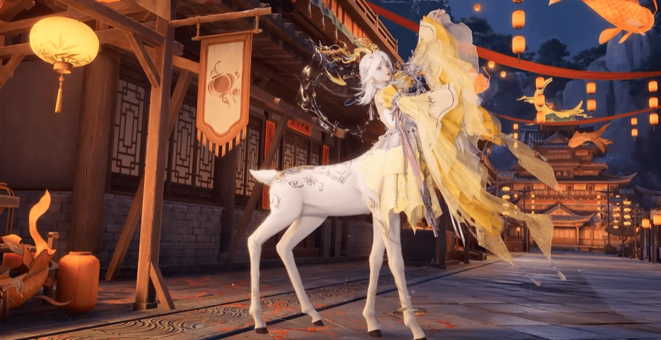 九色亦尘心则是另一个对比,它的设计灵感来自于九色山君,以金色为主色调,散发着耀眼夺目的光芒。满头如霜似雪的白发与头上的金色鹿角,以及身后悬浮着的光环,能显示出其神性。