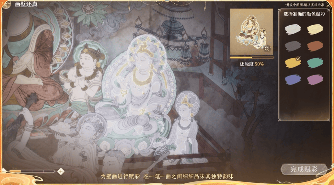 其次,2.2版本的许多玩法设计细节,也在用多种表现形式去挖掘中国传统文化。比如游戏即将与敦煌美术研究所合作,将敦煌壁画通过玩法做了进来,玩家将使用敦煌五色为壁画赋彩;