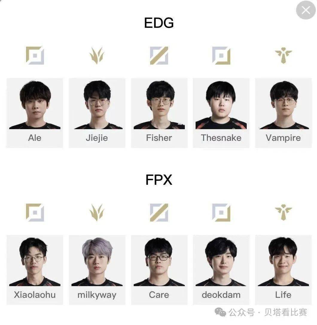 这场比赛双方的首发阵容如下,EDG这边首发上单Ale,打野jiejie,中单Fisher,下路thesnake加vampire;FPX首发上单xiaolaohu,打野milkway,中单care,下路Deokdam加life。