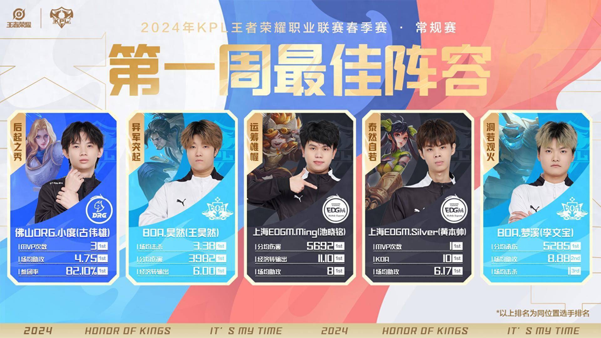 2024年KPL春季赛第一周最佳阵容和最佳选手出炉,BOA和EDGM在第一周都拿到了两连胜,也算是开赛至今最让人惊喜的两支队伍,在最佳阵容方面也是盆满钵满,各占两席。