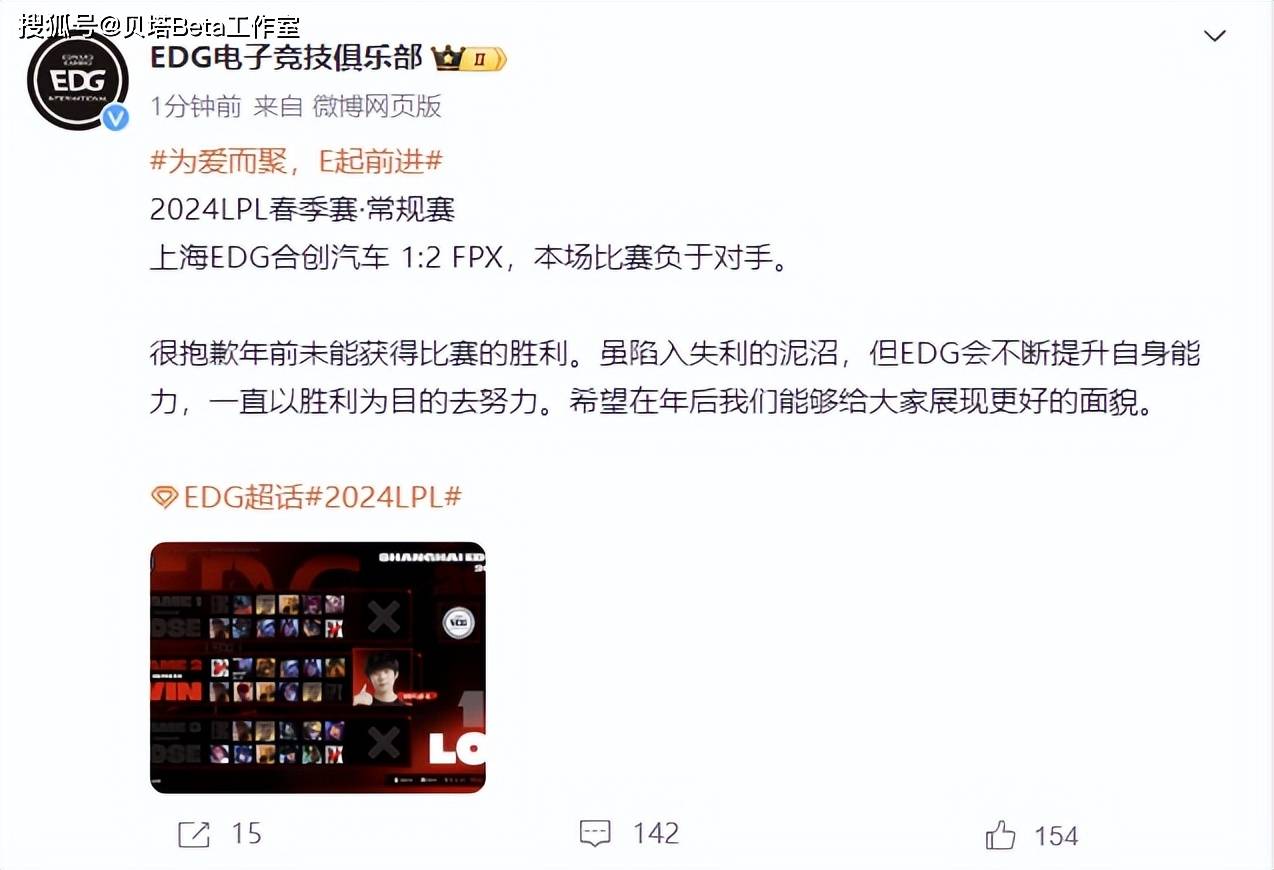 赛后EDG官博第一时间发文道歉,表示很抱歉年前没能取得胜利,但是EDG会继续提升自己的能力,年后会给大家展现更好的面貌。