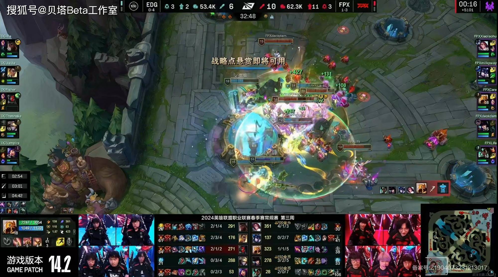 先简单回顾一下这场BO3,第一局EDG下路选了霞洛来打FPX的韦鲁斯和兰博,结果下路双人组在对线期就炸了,下路炸得太严重,导致整个游戏都没法玩,首局EDG可以说是被FPX速通了。第二局EDG更换了战术,jiejie火男疯狂抓上,帮助Ale贾克斯肥起来,凭借Ale贾克斯的出色发挥,EDG成功追回一局。第三局EDG给下路选出了EZ芮尔的组合,果然对线期下路又是劣势,让FPX的女警推塔节奏起来了,中期几波团战EDG的双C不断失误,虽然jiejie抢了好几条龙,但是也无力回天,最终团战FPX更胜一筹拿下胜利。