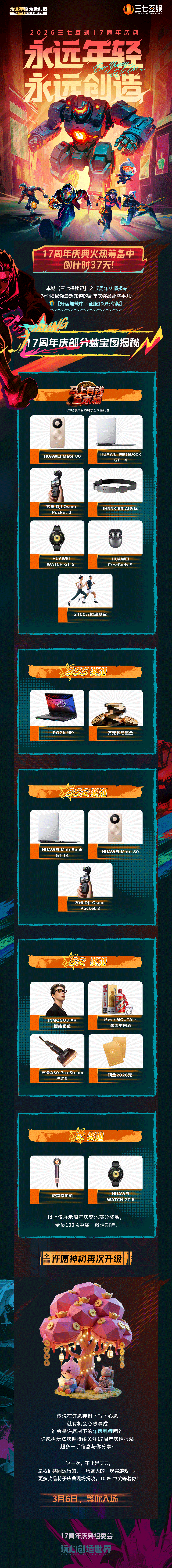 三七互娱奖池最高档包含华为电脑、手机、手表、耳机四件套以及大疆Pocket 3、脑机AI 头环,总价值2万元以上;“SSS奖池”则包含ROG枪神9笔记本或“万元梦想基金”。