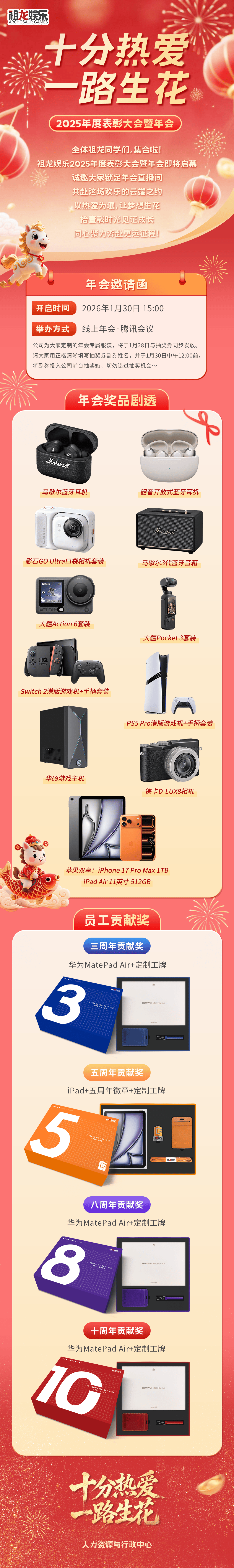 祖龙娱乐除了常规的奖池之外,还依照惯例为入职3年、5年、8年的员工颁发了相应的周年贡献奖,包含苹果/华为平板和定制工牌。