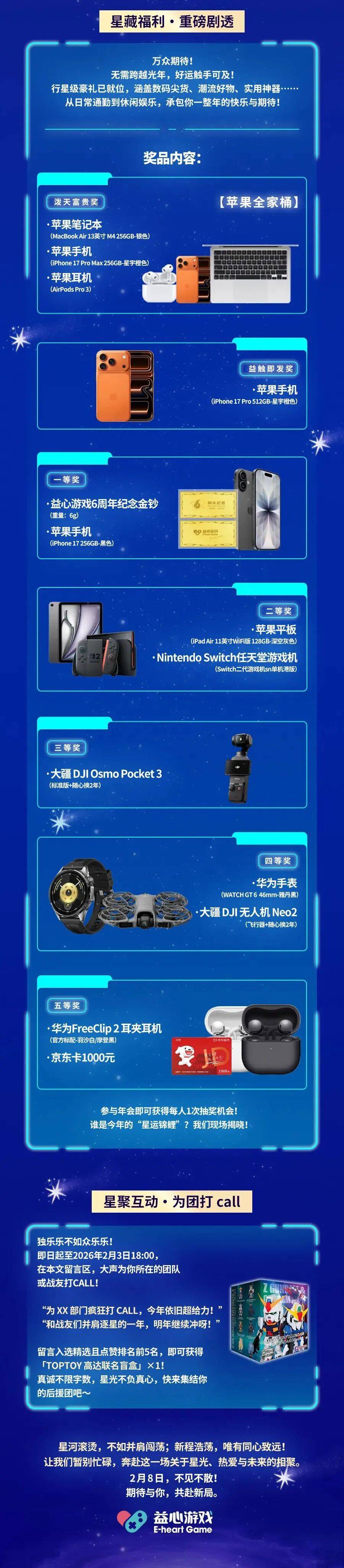 《星塔旅人》研发商悠星网络,最高档抽奖奖品“奇迹的星彩”为MacBook Pro或iPhone 17 Pro Max;阳光普照奖为PS5、手机平板等产品六选一。
