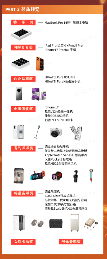 《三国:谋定天下》研发商华娱游戏的特等奖除了苹果全家桶外,还有LV ALL IN BB手袋可选;阳光普照奖除了苹果手表/耳机、Switch 2,还有飞天茅台和Snow Peak的露营椅。