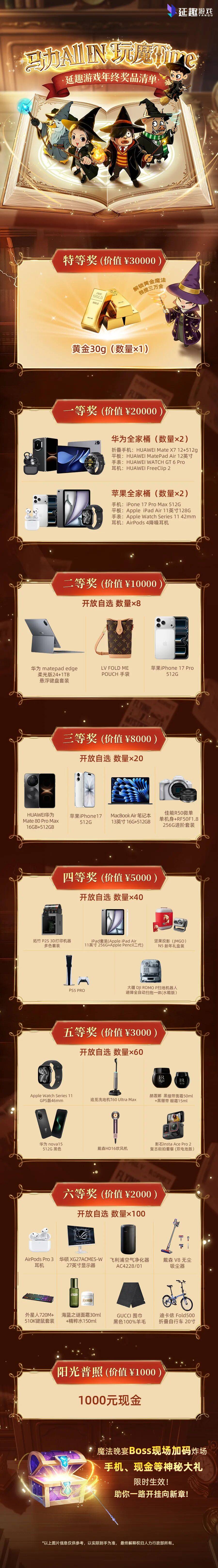 《叫我大掌柜》《寻道大千》研发商延趣游戏特等奖为价值3万元的30克黄金,一等奖是苹果/华为全家桶,阳光普照奖为1000元现金。