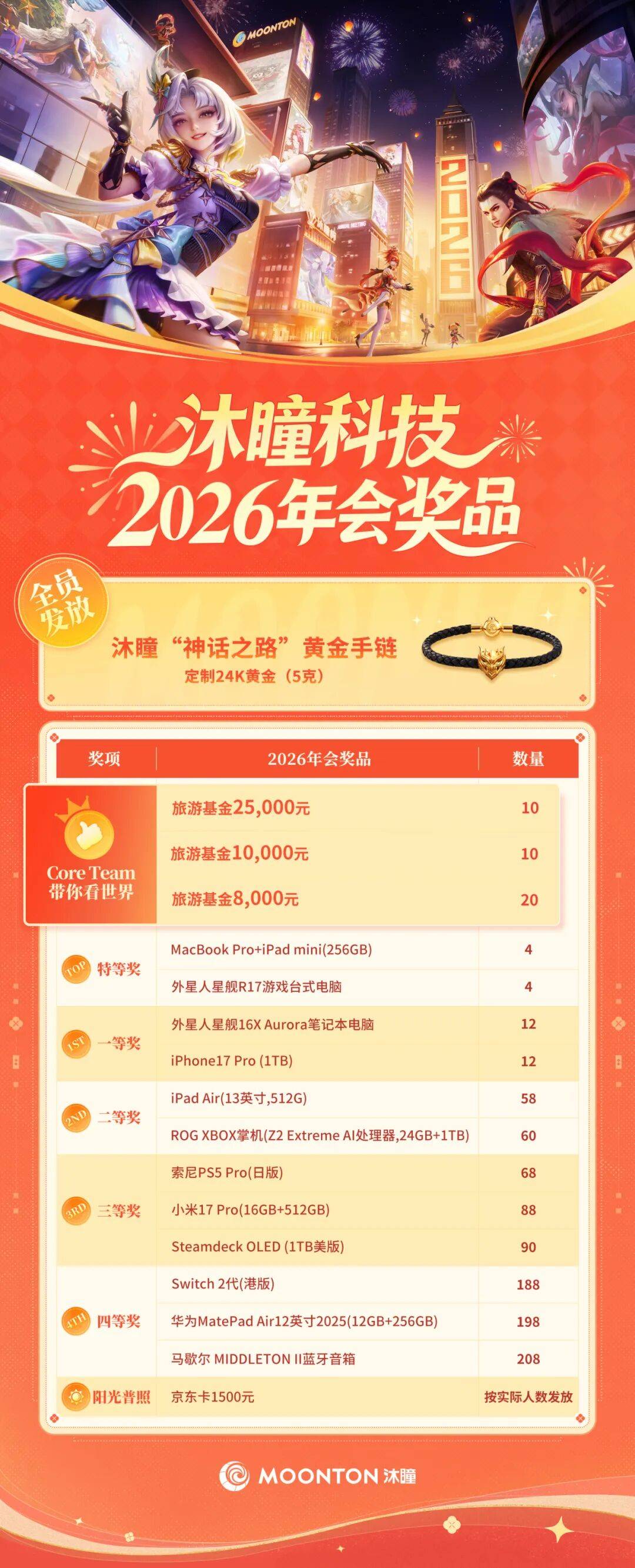 沐瞳科技给全员发放了定制的5克黄金手链“神话之路”。除了特等奖是价值2万元以上的外星人R17电脑或MaxBook Pro+iPad mini外,他们还有最高25000元的“Core Team带你看世界”旅游基金奖。阳光普照奖则是1500元京东卡。