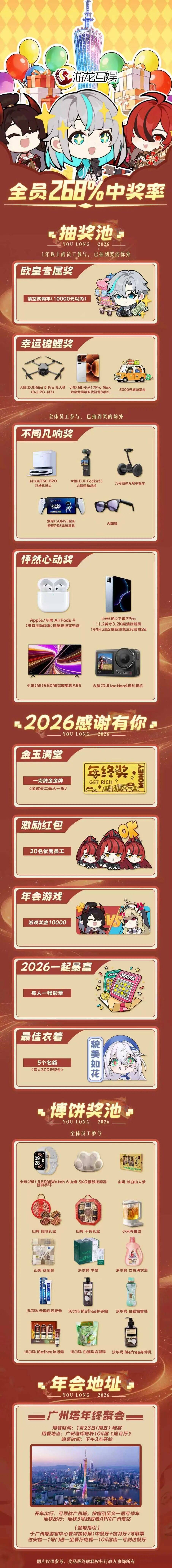 《史莱姆与地下城》研发商游龙互娱打出了“全员268%中奖率”口号,年会开在了广州塔,最高一档“欧皇专属奖”是在万元内清空购物车。他们还给全员发了1克金牌和1张彩票。
