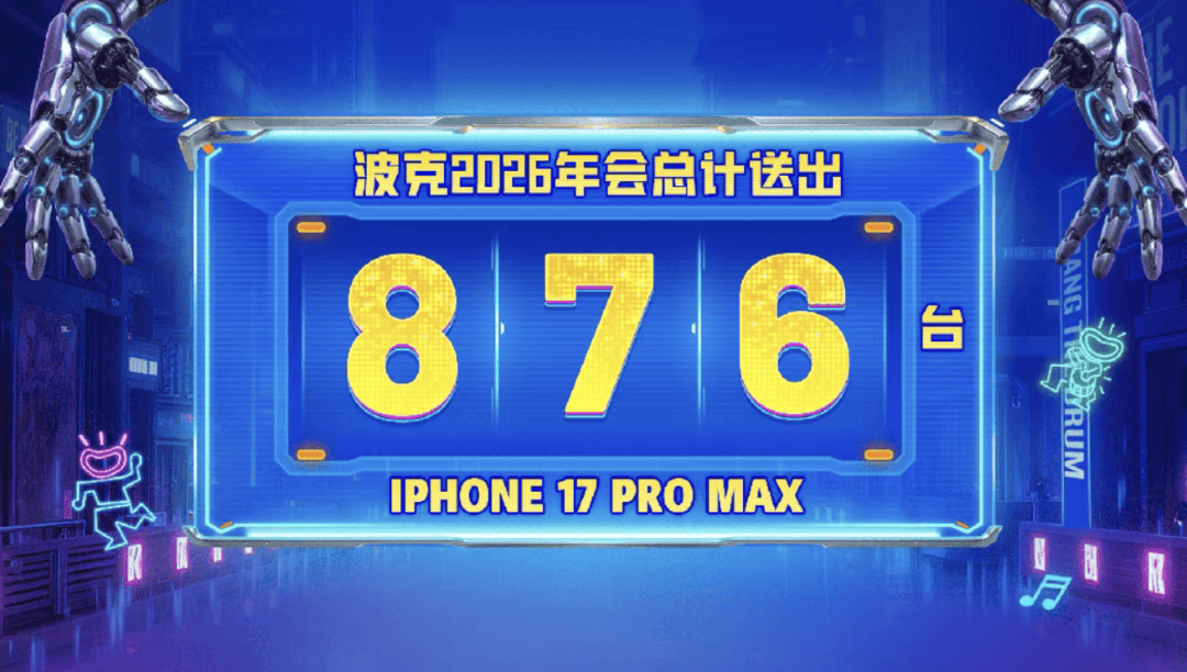 波克城市依然延续苹果狂欢,直接一张图展示战绩:“波克城市2026年会总计送出876台iPhone 17 Pro Max”,把iPhone 17 Pro Max送成了计量单位。按市场价估算,这一项支出接近千万。