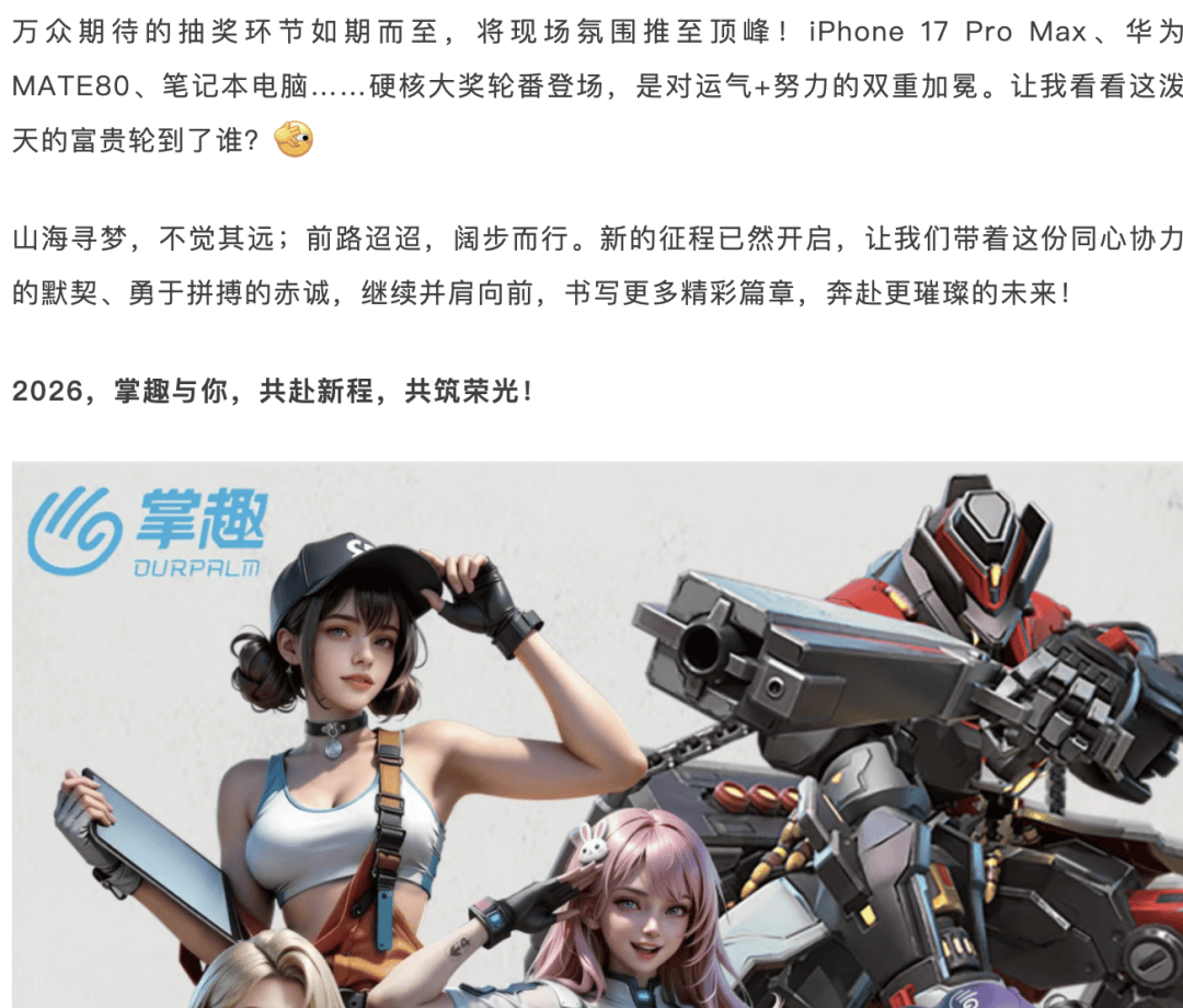 掌趣科技的奖池中有iPhone 17 Pro Max、华为Mate 80等产品。