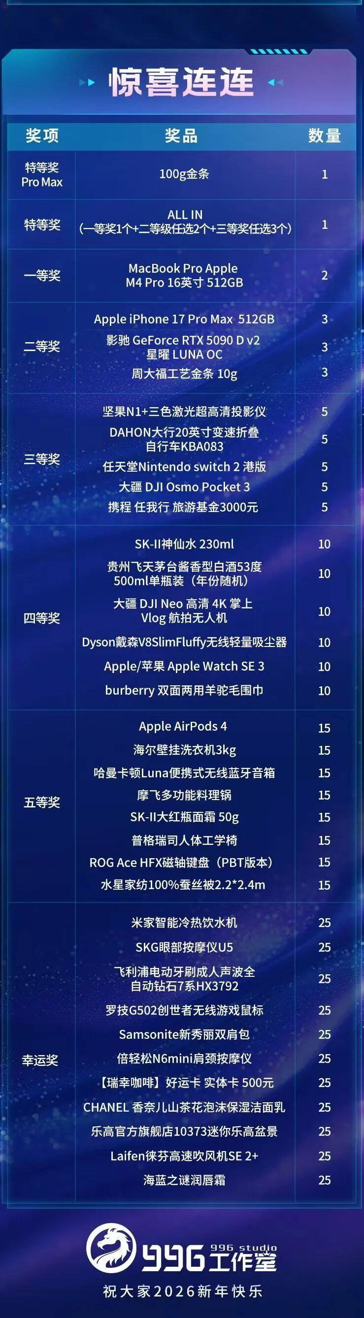 盛和网络旗下996工作室“特等奖Pro Max”上了100克金条,按目前金价算,价值10万元以上。其他奖品除了显卡电脑手机这种常驻奖,还有飞天茅台这种硬通货,护肤品、茶叶、家电也琳琅满目。