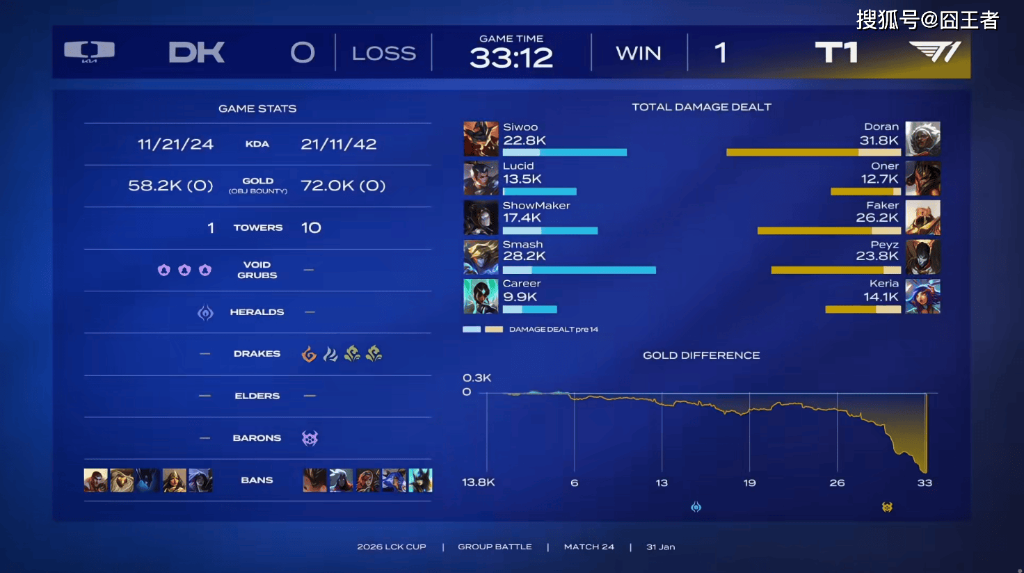 结果第一局比赛,被T1打成了碾压局。比赛前期,Doran安蓓萨对线实现压制,T1一度打出3000经济领先;比赛第28分钟左右,两队在野区爆发激战,ShowMaker发条残血双杀但T1打出2换3;比赛第30分钟左右,Faker沙皇单杀Career卡尔玛,随后T1大龙逼团打出0换3;最终比赛第33分12秒,T1团灭DK,一波结束比赛。