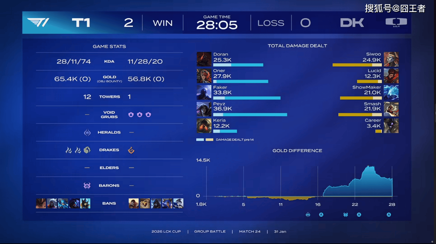结果第二局比赛,两队各打了半场好局,又是T1笑到了最后。比赛前15分钟,是DK打了好局;比赛第17分钟左右,T1小龙团打出0换5团灭DK,此后T1迅速拉开经济差;比赛第21分钟左右,T1大龙逼团打出0换4大胜DK后拿下大龙;比赛第23分钟左右,Oner蔚砍下三杀,T1一波打出0换4大胜;比赛第24分钟左右,T1打出0换3后拆掉三路高地;比赛第25分钟左右,DK打出1换3打退T1推家;最终比赛第28分05秒,T1团灭DK,一波结束比赛。