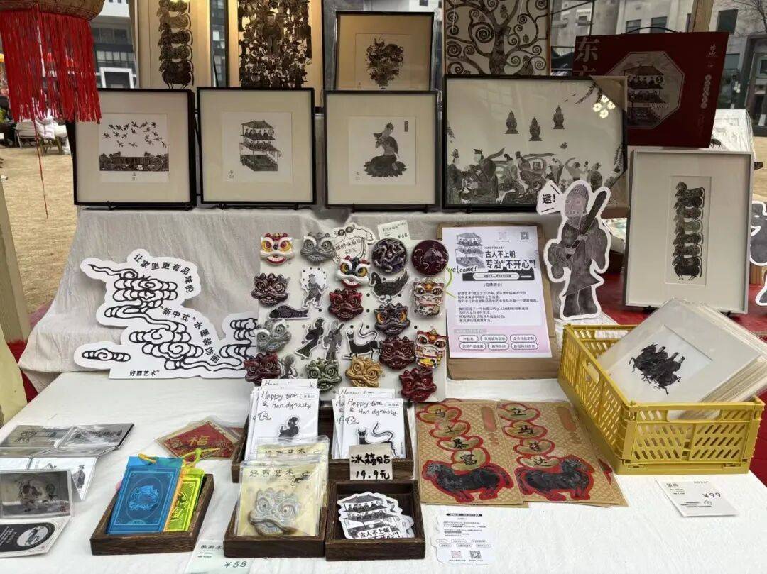 除了这些应景新品外,这次零售店还在店内以及园区的大草坪举办了名为“黑马会”的新春市集,现场设置了投壶、版画拓印、甲胄试穿、题福、Boss竞速挑战等互动游戏,同时还有小吃摊、捏面人、皮影戏等传统文化摊位,整体氛围接近一场小型庙会。