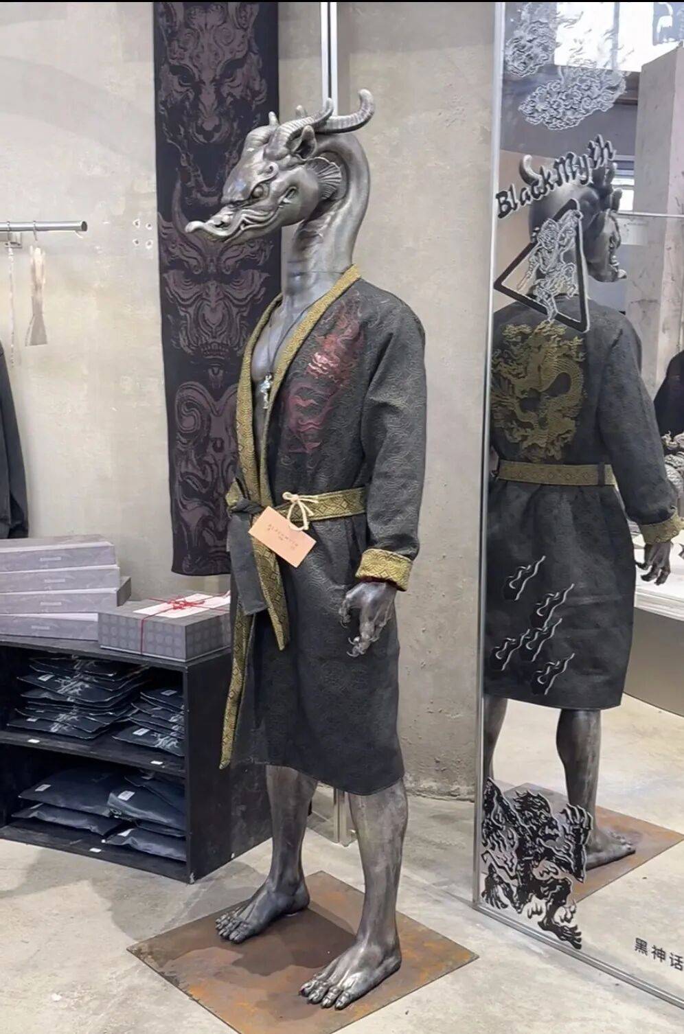 “黑神话BLACKMYTH”零售店是游戏科学官方衍生品品牌首家线下实体店,位于杭州西湖区转塘的凤凰创意园,紧邻游戏科学总部。店内陈列了雕塑、绘画等展品,主要售卖手办、服装、包袋、玩偶、配饰等周边,并配有咖啡区和室外休闲露台。