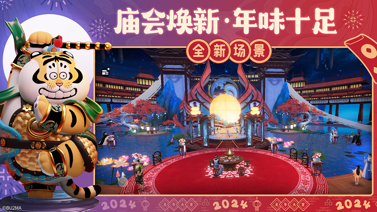 联动庆典活动“祥龙福虎庆喜年”,则在庙会场景鹿台处为玩家们准备了超丰厚的新年贺礼,玩家们可前往采集。“龙虎拜大年”活动将为玩家们献上新春的第一份好运红包,与此同时,全新的联动头饰、联动家具也将限时上线。