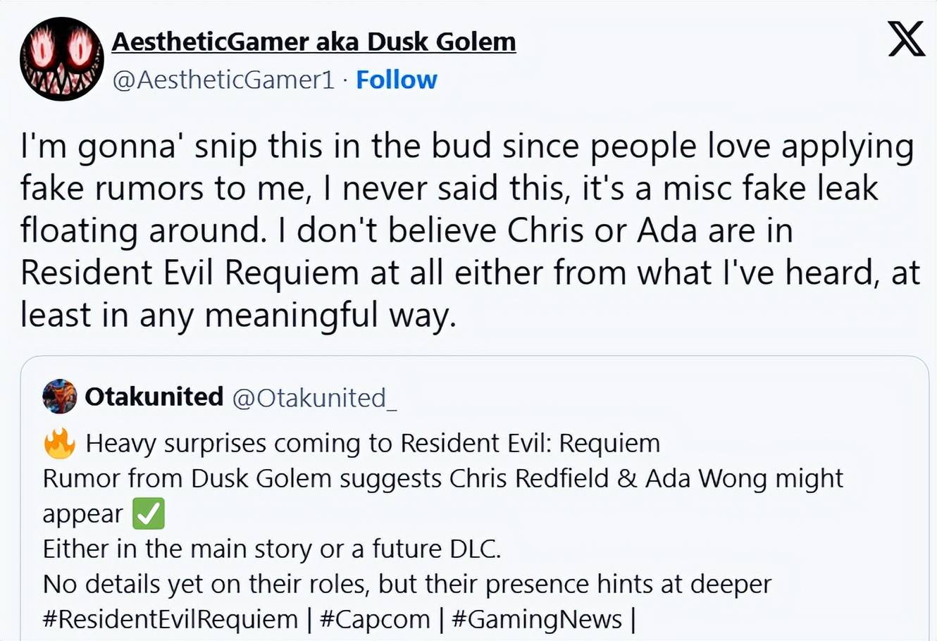 距离《生化危机9》(生化危机:安魂曲)发售还有不到一个月,各种传言接踵而至。最近,知名舅舅党Dusk Golem更新社媒,这次是澄清,他坚定声称生化9中不会有艾达·王和克里斯。