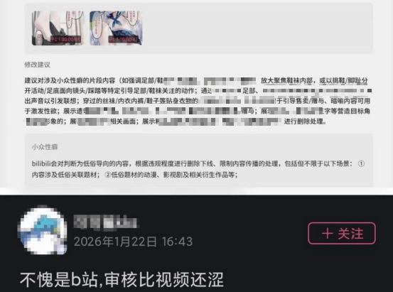 如果你对“足控”仍然感到不解,建议在B站随便上传一个“足控”素材,然后在他们官方的审核意见里,对相关元素进行深入学习,看完他们的审核意见并充分理解了这些东西为什么色后,你基本就出师了——我称这种定律为“最色的内容都写在官方的审核意见里”。