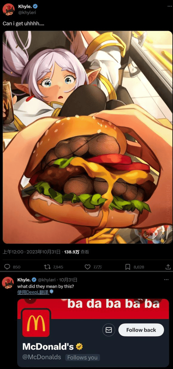 前几年因为麦当劳那个著名的动画广告,兴起过一阵相关角色的二创。在这场二创活动里,给我印象最深刻的不是那些“平铺直叙”,内容直白的涩图,而是我在相关创作里,找到的一张麦当劳官方关注的画师,所画出来的一幅“芙莉莲双层玉足吉士堡”。
