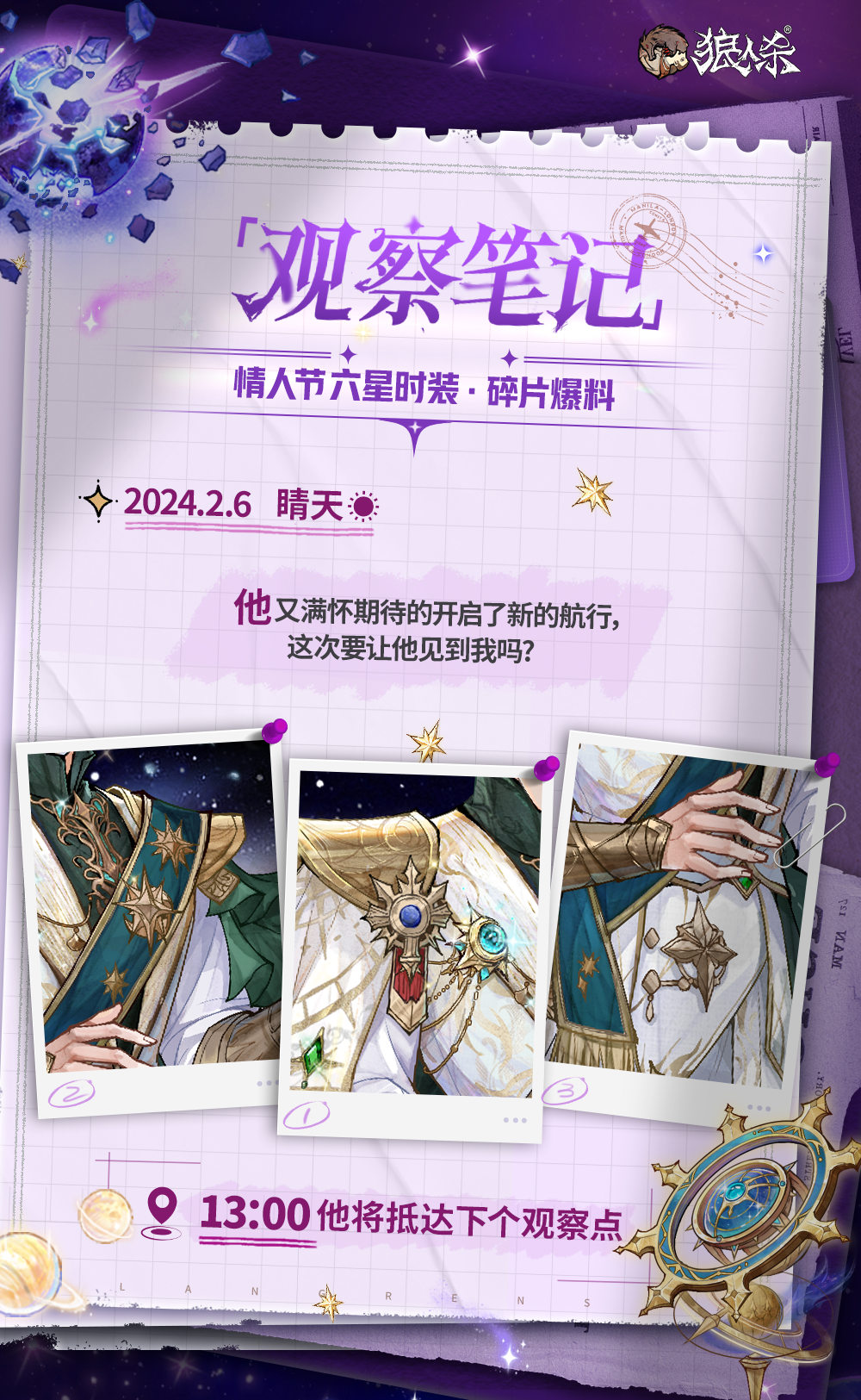 穿越时空,只为追寻你!狼人杀2024年首款六星时装来袭,时装故事与碎片爆料抢先开启。在宇宙中的航行,和每一次观察点的相望,他们究竟能否成功相遇?2月14日情人节带你解锁宇宙级的浪漫之旅!
