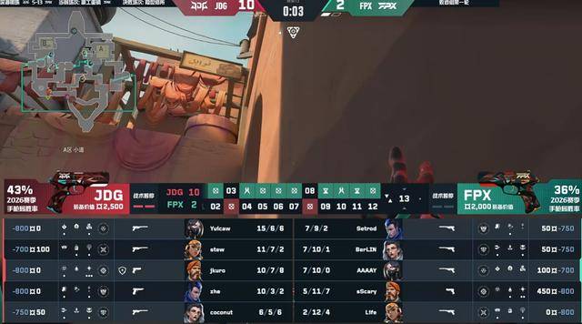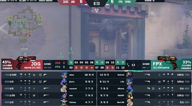 上半场FPX在防守端赢下手枪分,JDG的奖励分在B点打掉FPX的回防,并且只掉两把枪。