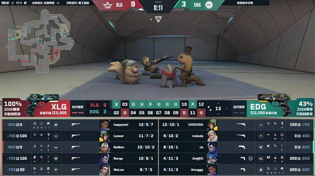 XLG连追三分,面对EDG的快攻,XLG精准枪法成功化解。第10回合EDG逮捕到NoMan的冥驹,EDG提速进点,但被Rarga换掉两个,球球包点展开毒雾,但XLG的回防在混烟之中将EDG打掉。