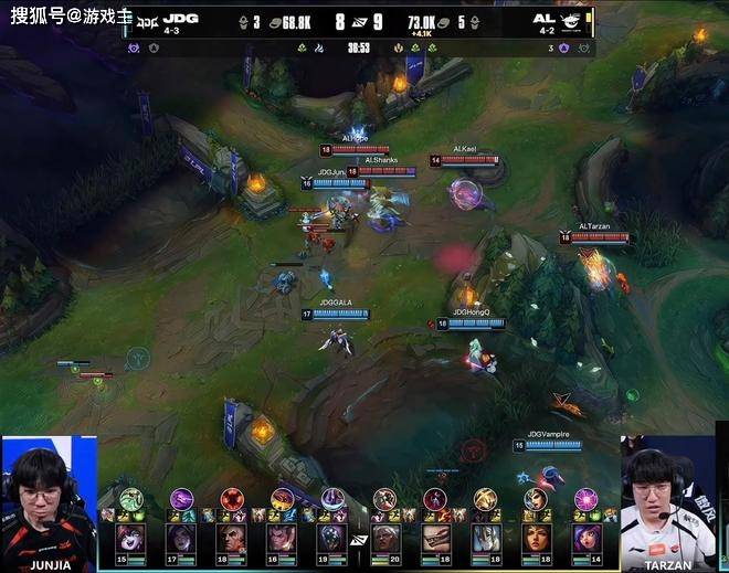 第一波是上路河道,解说表示,jdg战队只需要往后拖,几个大核英雄就可以稳定输出,话音刚落,Junjia的赵信一个爆炸果实超远距离就冲入到了人群之中,既没有留人技能,和队友的距离也有些远,根本留不住al的众人,开了大招拉开之后,被AL分割战场。如果说这波之后双方还有拉扯的机会,那下一波的中路开团彻底看不懂了。本来大家都在龙坑拉扯,结果赵信又是直接闪现大招,冲到了轮子妈的脸上,面对一个有罩子的AD轮子妈,怎么可能直接秒杀,只能是赵信技能全交被对方拉开。结果可想而知,那一波团战jdg战队溃败。