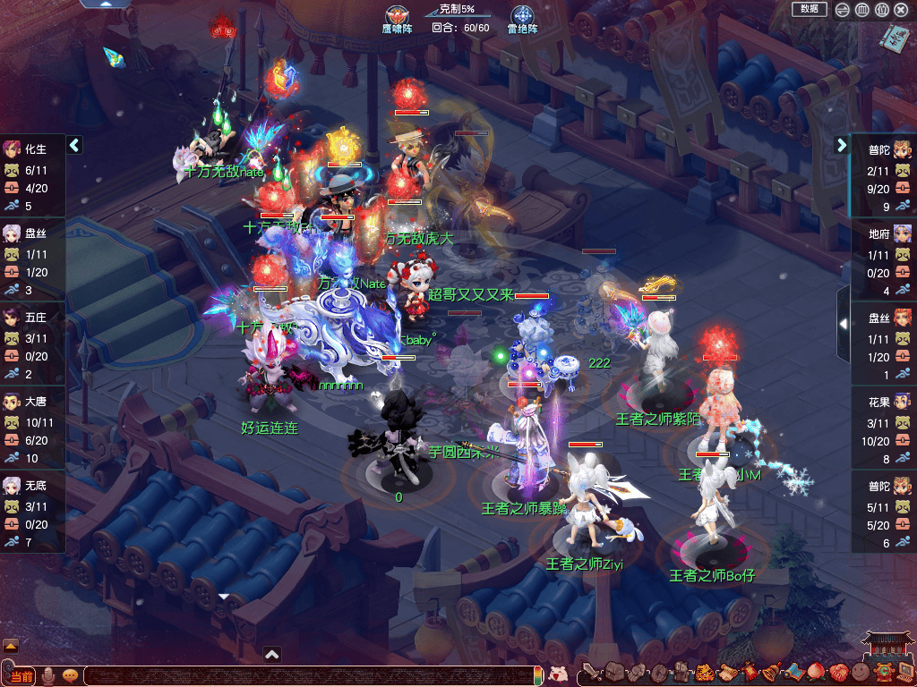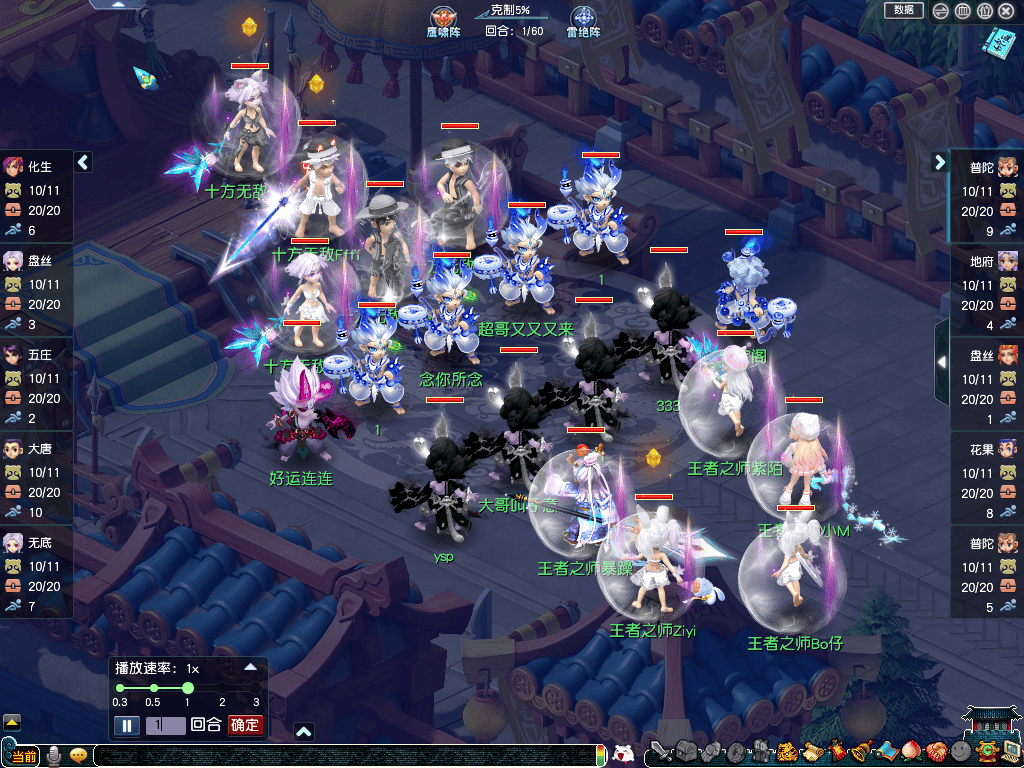 【王者之师】(观战方)阵容为:咒师普陀、地府、盘丝、花果山、咒师普陀;