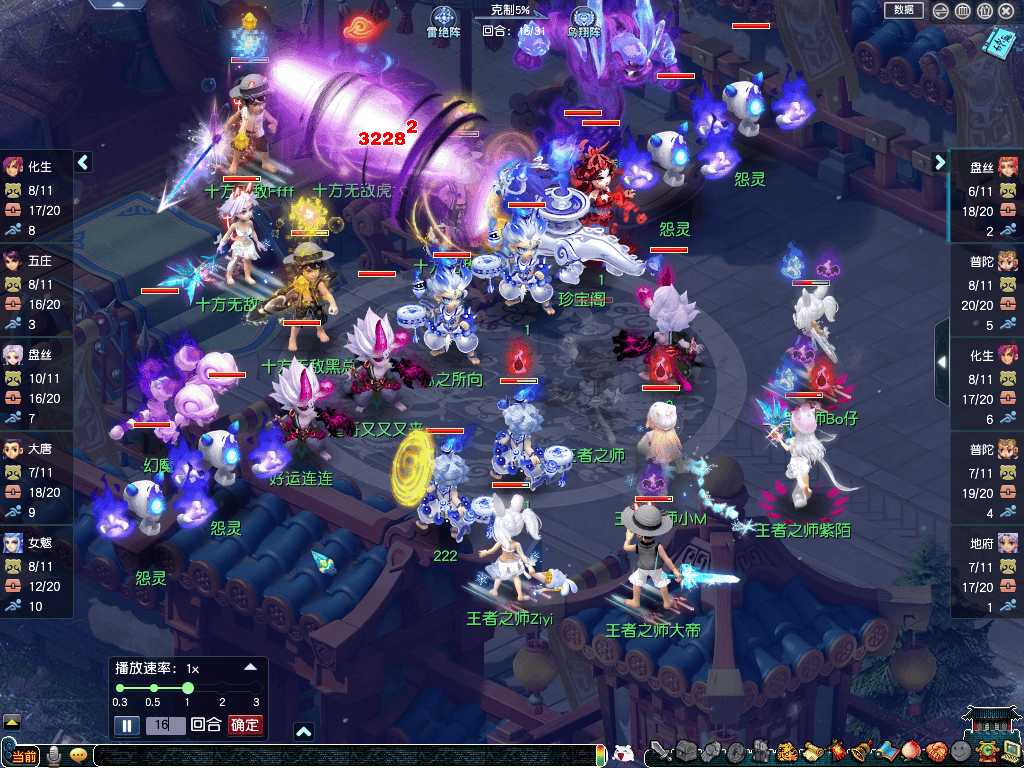 【十方无敌】迅速应对,通过五庄观“天地同寿”规避双咒师的部分伤害。战至第十回合后,【王者之师】持续发起攻势,接连召唤攻谛听针对【十方无敌】大唐官府进行压制,并在第15回合对其五庄观发起致命点杀,攻谛听一度造成32282点的爆炸伤害。