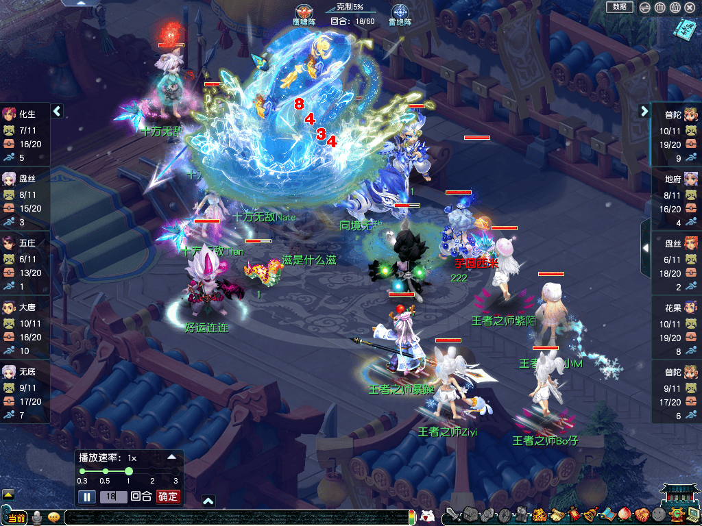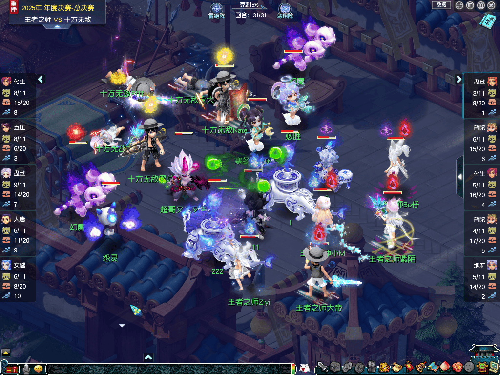 前期【王者之师】牢牢掌控节奏,第18回合更凭借超级鲲鹏的补刀,配合小死亡成功点倒【十方无敌】五庄观。